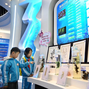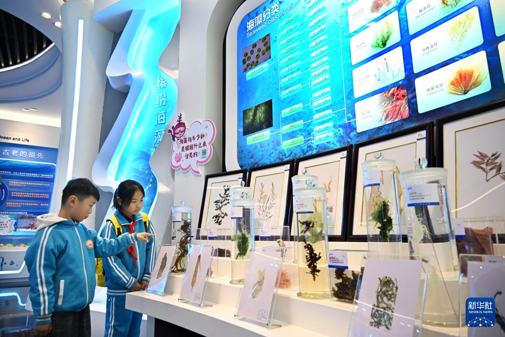 兩名小學生在明月海藻集團海藻科技館內參觀(11月14日攝)。新華社記者 李紫恒 攝