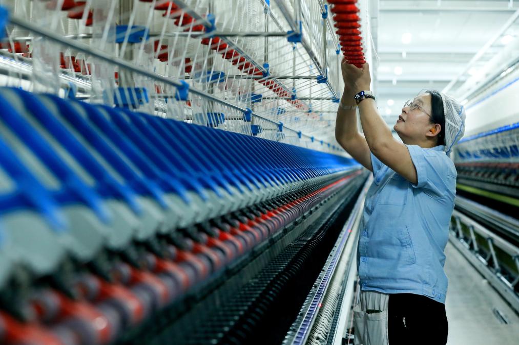 12月12日,青島即發紡織科技有限公司的工人在智慧紡紗生產線上生產高端纖維(2024年12月12日)。新華社發(梁孝鵬攝)