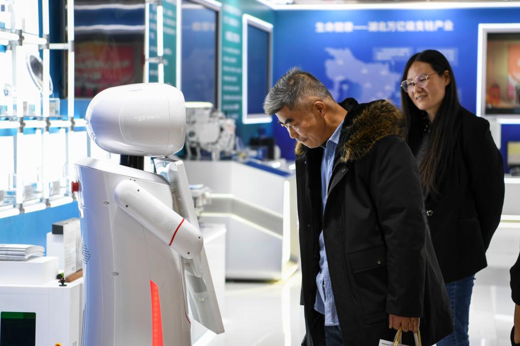11月27日,參觀者在第二屆中國國際供應鏈促進博覽會主賓省湖北展臺與智能機器人互動(2024年11月27日)。新華社記者 張豪夫 攝