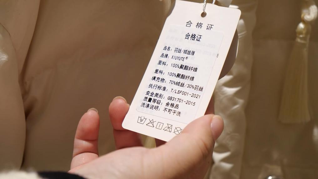 近日,記者來到江西省九江市一處羽絨電商創業園,這里的4家企業不久前被曝光以“絲”代“絨”,吊牌虛標材質,涉嫌以次充好。記者探訪園區內多家服裝店后發現,店鋪掛售的羽絨服裝已經全面更新了吊牌標識,以符合新國標要求,另有一些服裝吊牌上則標明填充物為“羽絲”“絨絲”。
