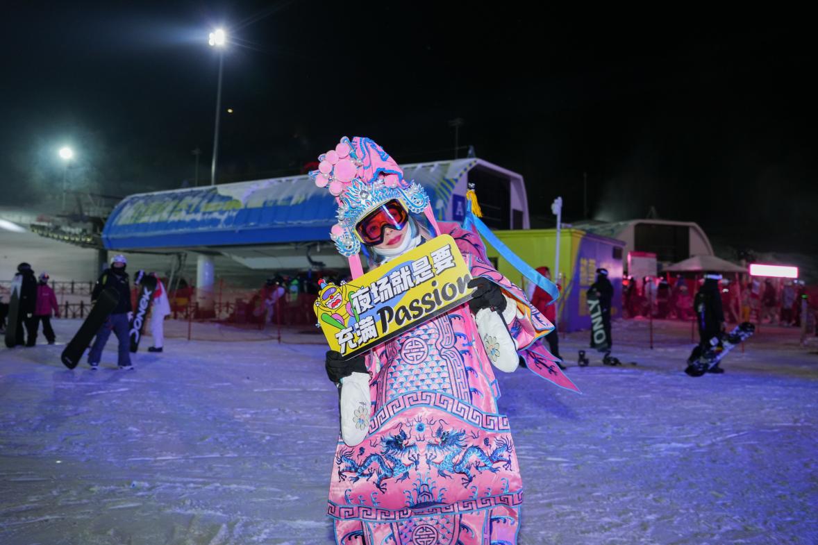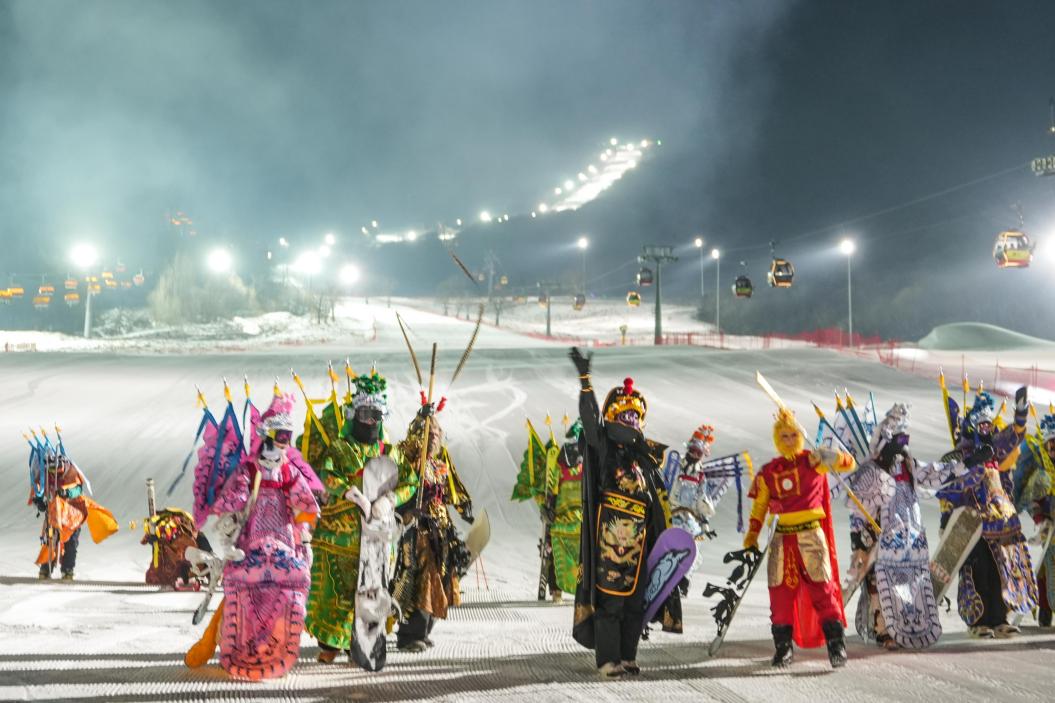 夜幕降臨,華燈初上。吉林市萬科松花湖度假區的雪道在燈光和煙火的映襯下化作一片奇幻舞臺。伴隨《林海雪原》《智取威虎山》等經典旋律,20多名滑雪愛好者身著京劇、川劇等戲服從山頂飛馳而下,贏得觀眾陣陣歡呼。