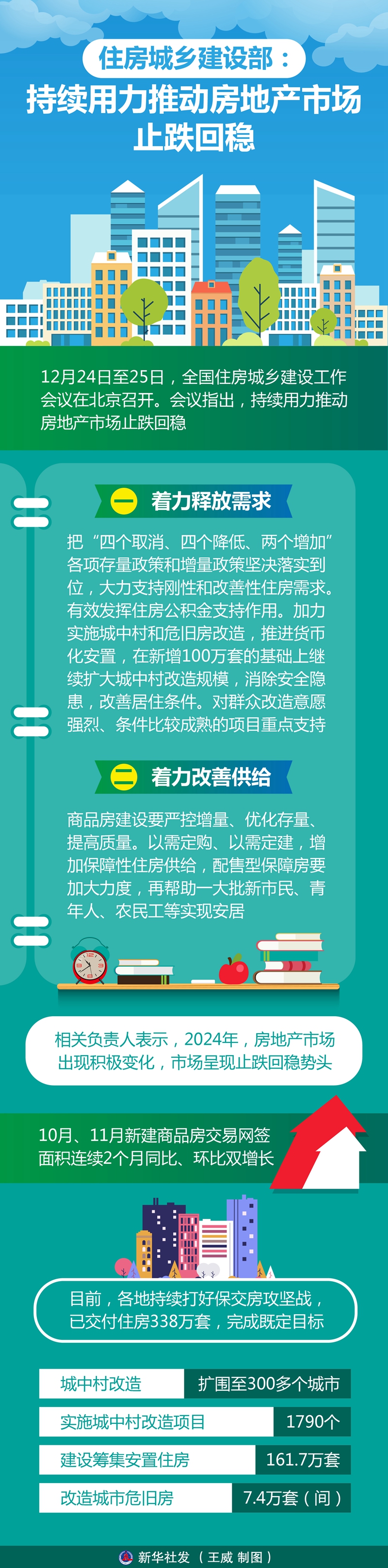 12月24日至25日,全國住房城鄉建設工作會議在北京召開。會議指出,持續用力推動房地產市場止跌回穩。一是著力釋放需求。把“四個取消、四個降低、兩個增加”各項存量政策和增量政策堅決落實到位,大力支持剛性和改善性住房需求。有效發揮住房公積金支持作用。加力實施城中村和危舊房改造,推進貨幣化安置,在新增100萬套的基礎上繼續擴大城中村改造規模,消除安全隱患,改善居住條件。對群眾改造意愿強烈、條件比較成熟的項目重點支持。