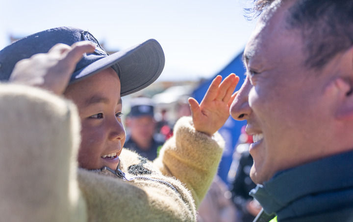 2025年1月14日,在西藏定日縣長所鄉嘎布村,一個孩子戴上移民管理警察米瑪次仁的帽子敬禮。新華社記者 丁增尼達 攝