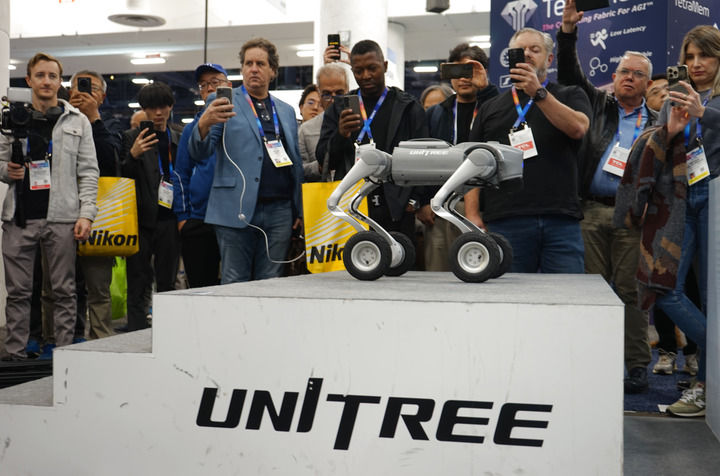 2025年1月8日,在2025年美國拉斯維加斯消費電子展(CES)上,人們在中國企業宇樹科技的展區觀看機器狗展示。新華社發(曾慧攝)