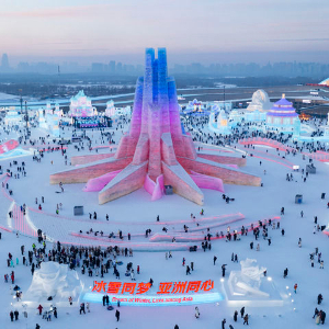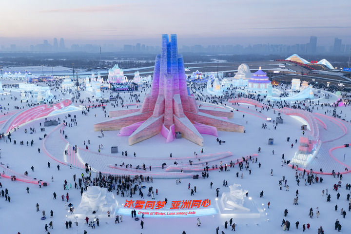 2025年1月5日,在哈爾濱冰雪大世界園區,游客在主塔“亞洲同心”附近游玩(無人機照片)。新華社記者 謝劍飛 攝