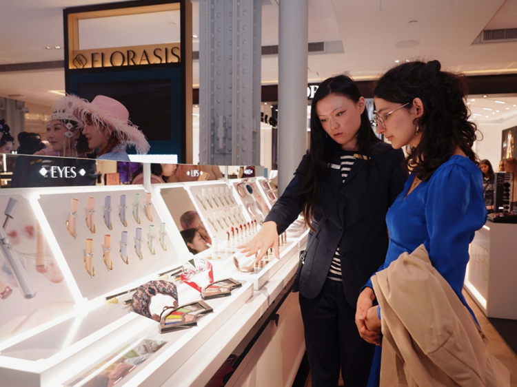 圖為消費者在巴黎百貨商場莎瑪麗丹內的花西子專柜前選購商品(品牌提供)