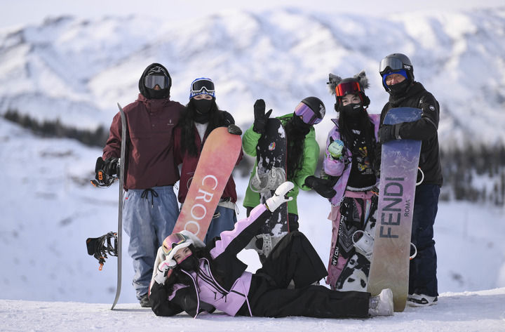 2025年1月28日,來自浙江的“95后”姑娘張琦彬(前)與一起滑雪過年的同伴們在新疆阿勒泰將軍山國際滑雪度假區合影。新華社記者 胡虎虎 攝