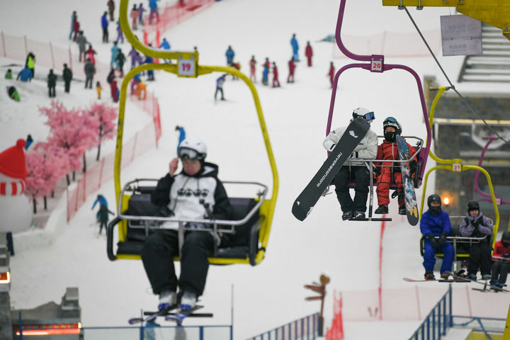 2025年1月12日,在成都熱雪奇跡室內滑雪場,滑雪愛好者搭乘索道前往高級道。新華社記者 胥冰潔 攝