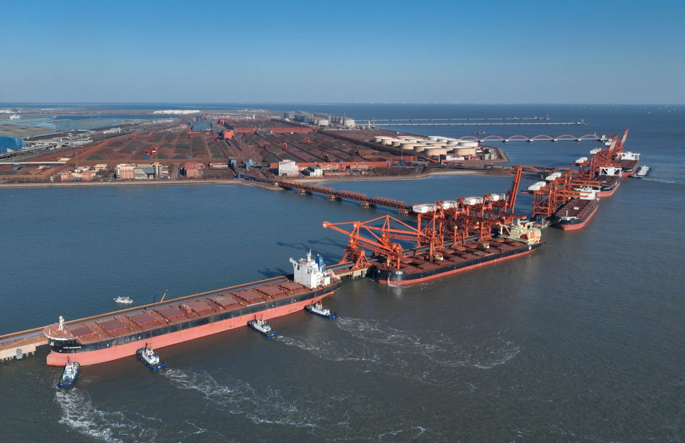 2025年1月9日,輪船靠泊在河北唐山港曹妃甸港區礦石碼頭卸載(無人機照片)。新華社記者 楊世堯 攝