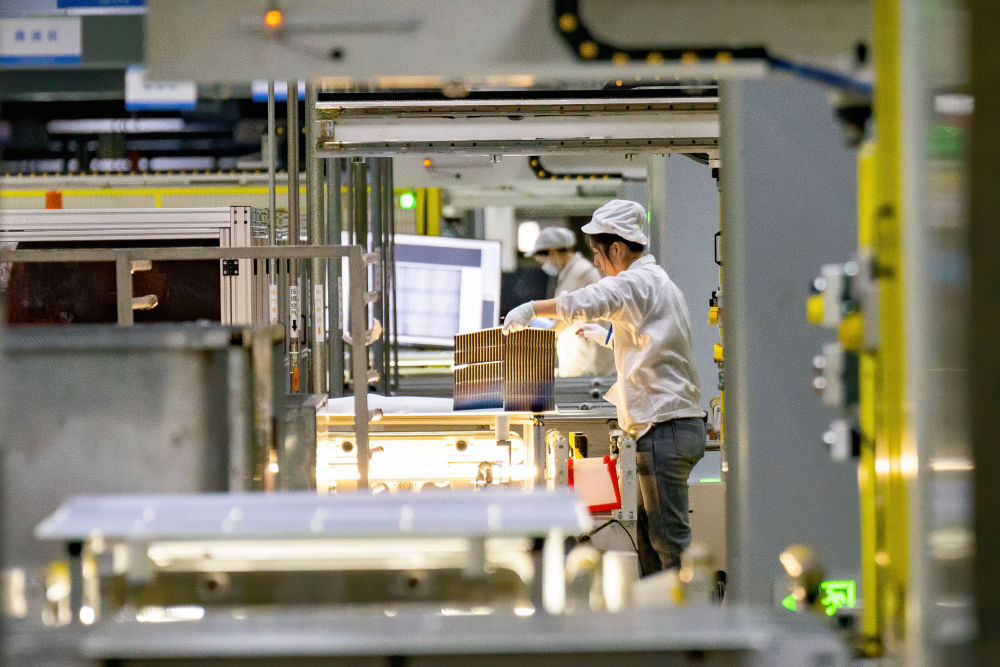 2025年2月13日,在位于安徽省合肥市肥東縣的合肥循環經濟示范園內一光伏組件企業車間,工人在生產線上忙碌。新華社發(阮雪楓 攝)