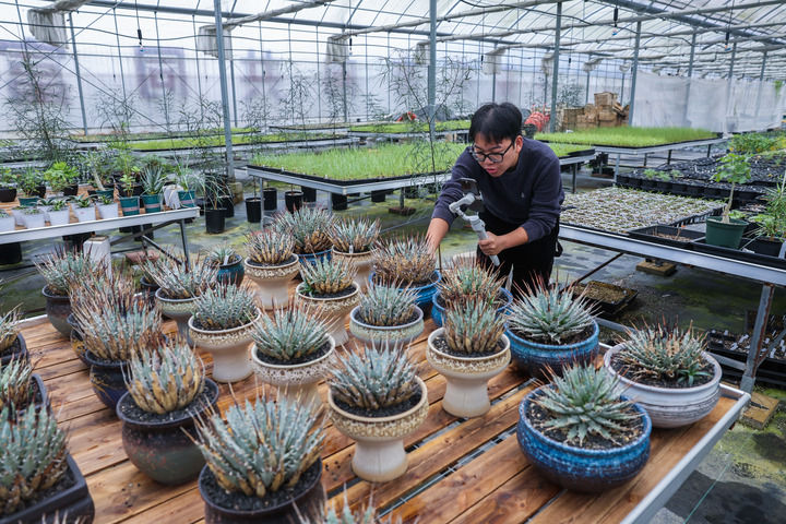 2024年3月19日,蔬菜種植戶在山東省濰坊市寒亭區的智能溫室大棚里進行管護作業。新華社記者 徐速繪 攝