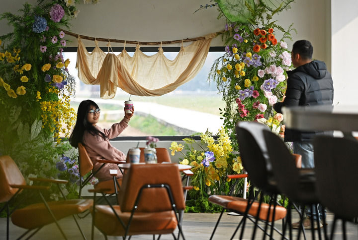 2024年12月3日,游客在浙江省桐廬縣梅蓉村鄉村會客廳宏逸咖啡館拍照打卡。新華社記者 盧哲 攝