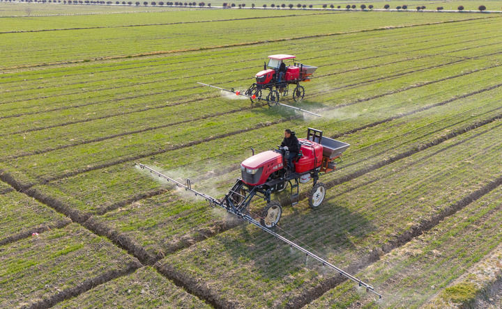 2025年2月20日,在江蘇省南通市通州區十總鎮育民村高標準農田,農民駕駛植保機械對進入返青期的小麥開展病蟲害防治作業(無人機照片)。新華社發(翟慧勇攝)