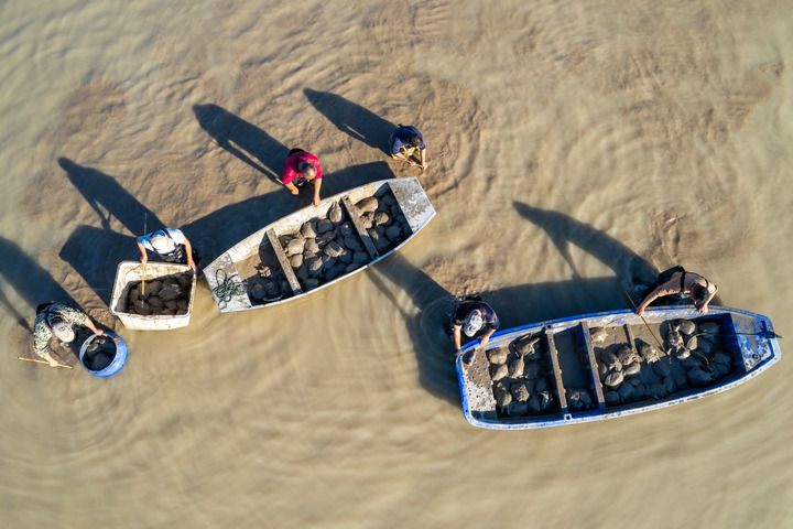 2024年11月29日,工人在位于湖南省漢壽縣的湖南華甲農業集團有限公司生態甲魚產業園捕撈甲魚(無人機照片)。新華社記者 陳思汗 攝
