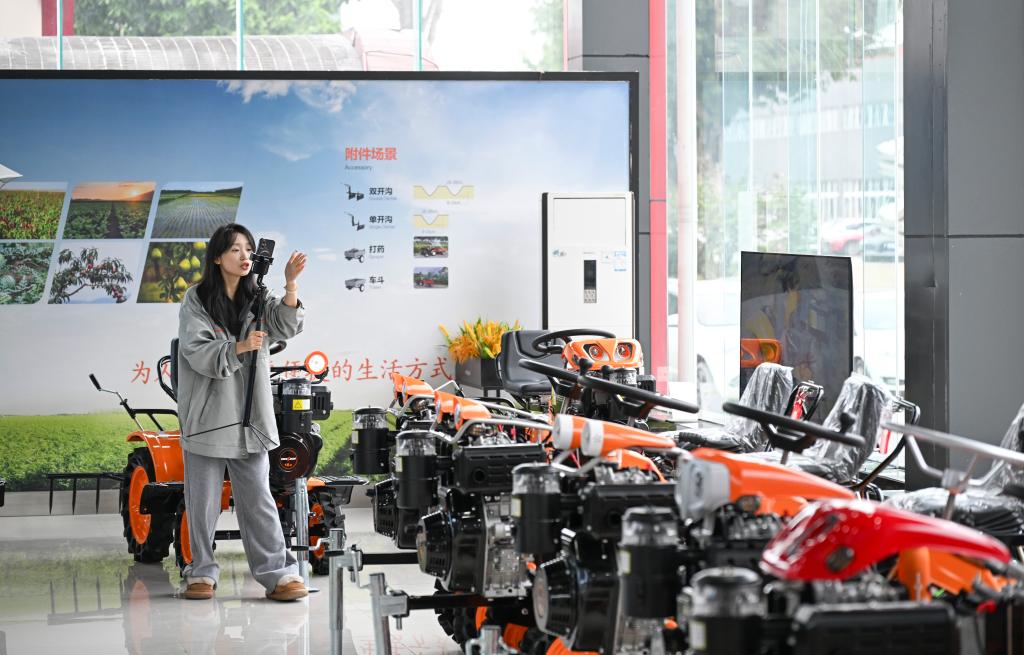 2月22日,銷售人員在重慶華世丹機械制造有限公司展廳通過直播推介農機產品。新華社記者王全超 攝