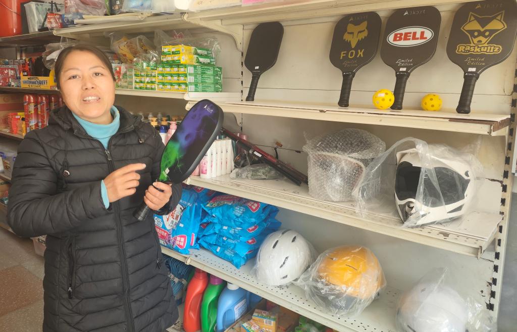 在江西省贛州市上猶縣陡水鎮月仔村,村民曾七鳳正在介紹自家雜貨店的匹克球拍。新華社記者姚子云 攝