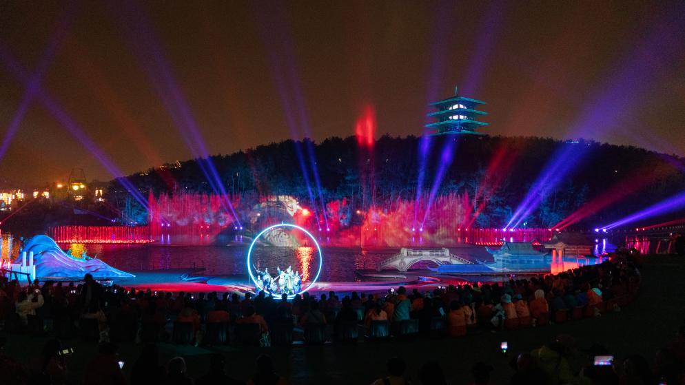 2月28日晚,湖北省荊門市園博園的水幕燈光秀。新華社記者熊翔鶴 攝