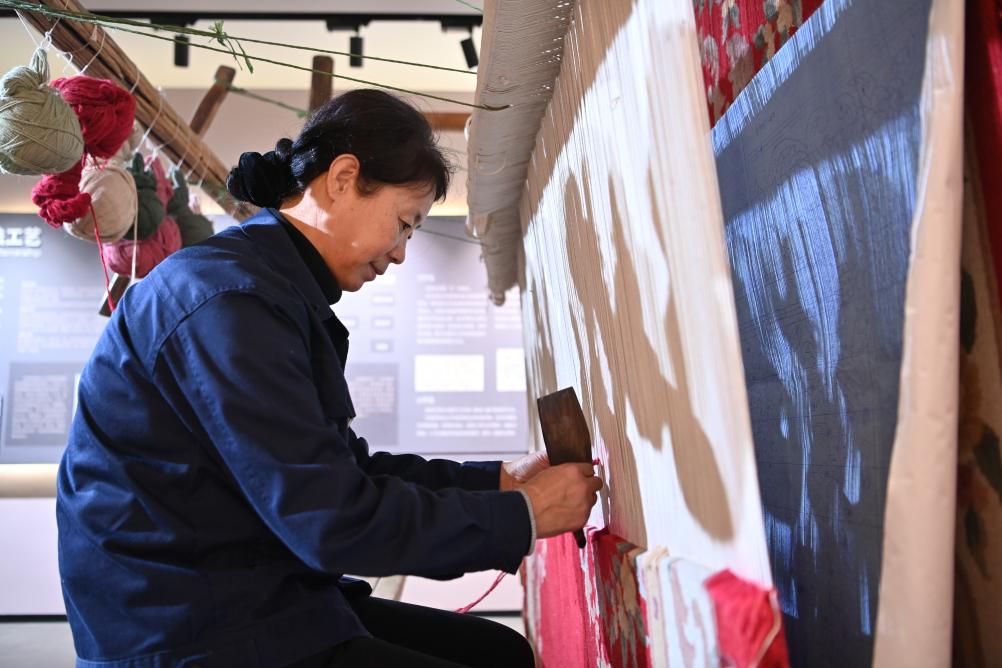 “織采宮”織毯工人展示手工羊毛栽絨地毯工藝。新華社記者 李然 攝