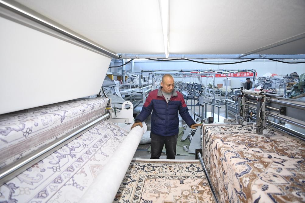跟隨周新亮步入公司生產車間,織毯機器隆隆作響,工人們埋頭勞作,一垛垛成品地毯被貼簽裝箱,準備發往世界各地。周新亮說,去年冬天以來,地毯生產進入旺季,來自國內外的訂單將一季度排得滿滿當當。