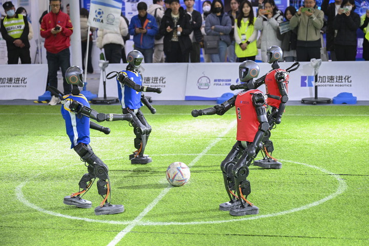 2月21日,機器人在2025全球開發者先鋒大會現場踢足球。新華社發(陳浩明 攝)