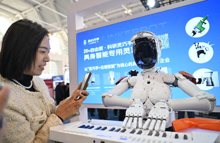3月6日,在國家會展中心(天津),觀眾觀看一款安裝有靈巧手的機器人彈鋼琴。新華社記者 孫凡越 攝