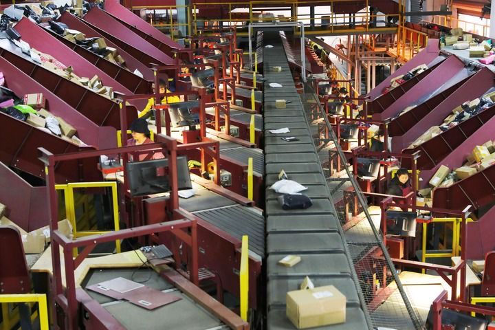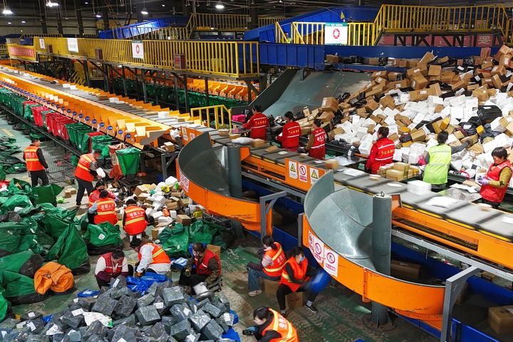 在江蘇沭陽一家物流中心,工作人員在分揀包裹(3月17日攝)。