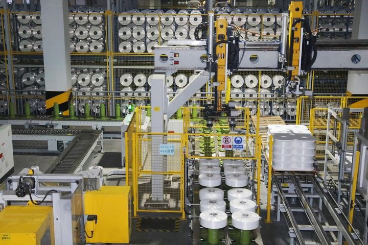 江蘇沭陽的江蘇桐昆恒陽化纖有限公司智能化生產線(3月4日攝)。