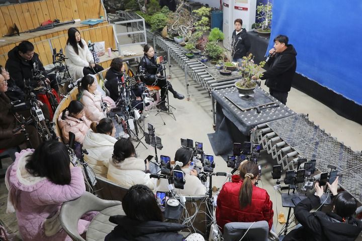 在江蘇沭陽一家盆景直播基地,主播們在拍賣盆景(3月17日攝)。