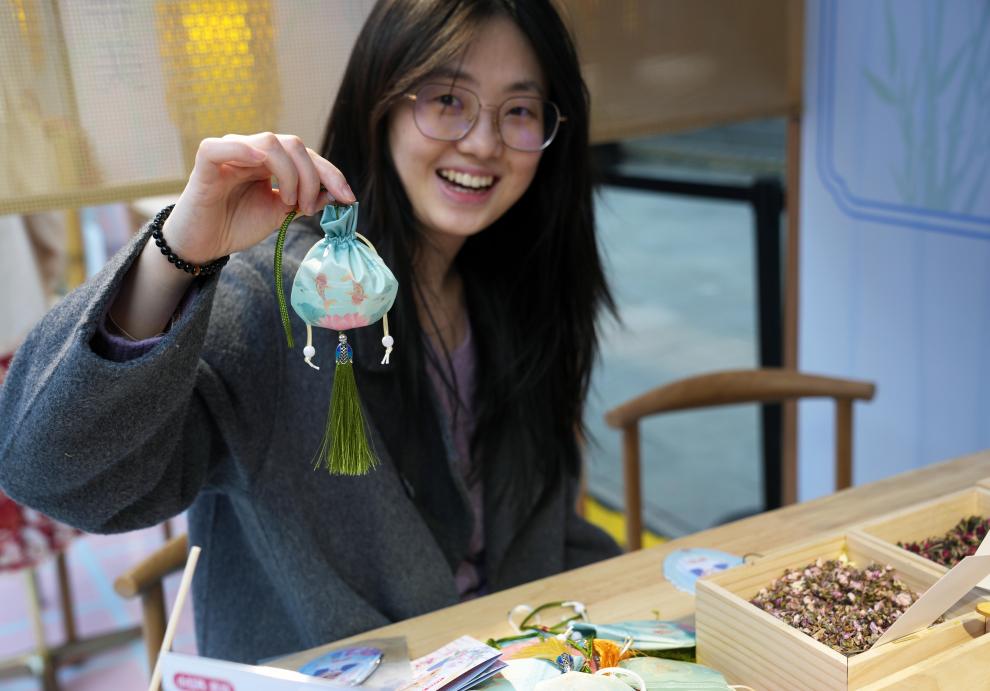 2025年3月20日,游客在上海豫園商城的國潮市集上體驗手作香囊。新華社記者 劉穎 攝