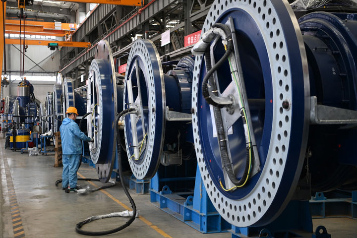 走進酒泉經濟技術開發區甘肅明陽智慧能源有限公司總裝廠車間,自動化機械設備高速運轉,3條風機組裝生產線同時開工,經過輪轂裝配、主軸裝配、傳動鏈裝配等工序后,一臺風機的主體部分便組裝完成。