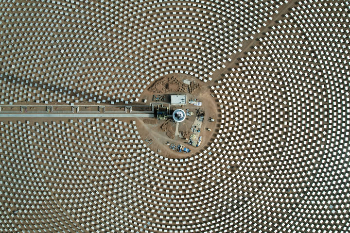 瓜州境內的廣袤戈壁灘上,兩座約200米高的吸熱塔拔地而起,比肩而立;高塔四周,近2.7萬面定日鏡以同心圓的方式緊密環繞,組成占地4400多畝的巨大反射鏡場,相當于411個標準足球場大小。