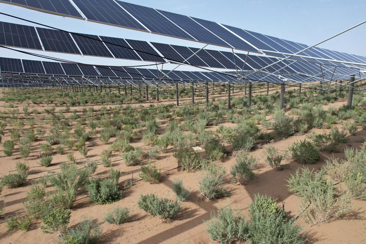 與傳統光伏板的建造形式不同,該項目光伏板架設高度達4米,配置雙面光伏板發電,發電效率提高了8%至15%。板上發電、板下種植,一地多用,立體發展。截至目前,武威已規劃建設占地50萬畝、總裝機容量達1500萬千瓦的光伏治沙產業園,成為西北地區重要的光伏治沙產業園區。