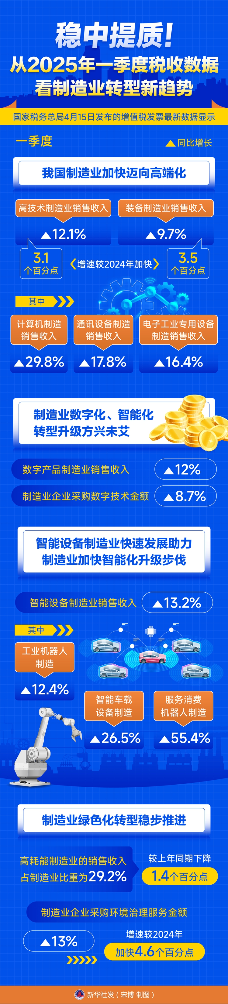 國家稅務總局4月15日發布的增值稅發票最新數據顯示,今年一季度,我國制造業發展穩中提質,高端化、智能化、綠色化轉型升級加快推進。