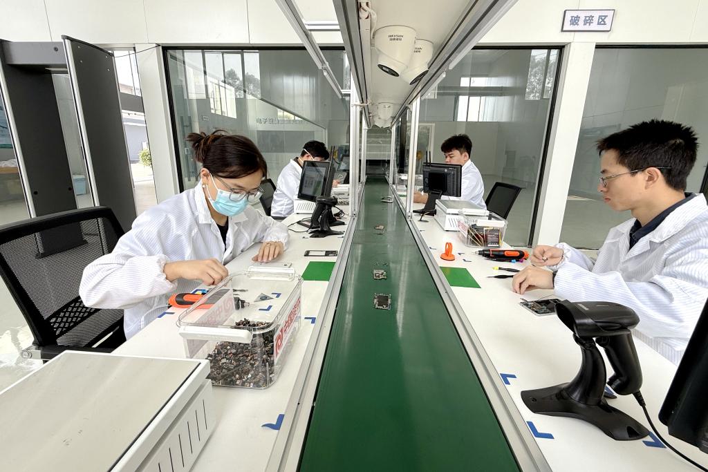 中國資環集團手機安全回收處置項目負責人廖歡樂介紹,集團與中國郵政速遞物流深度合作,打通了安全回收流轉路徑,手機的回收、流轉、拆解和破碎等全程可視化、可監控、可溯源。