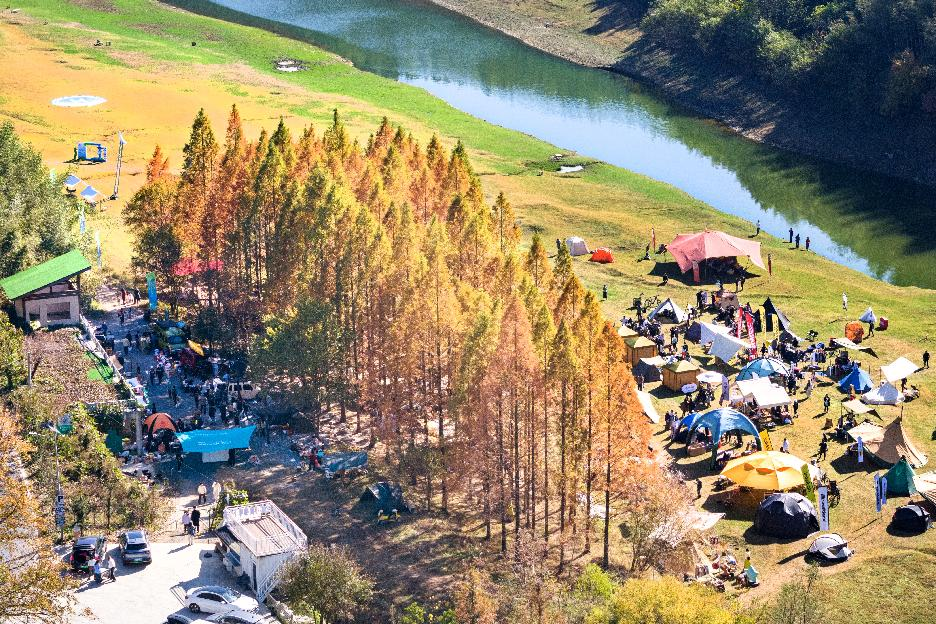 游客在安吉夏陽村的露營地里休閑游玩(2024年11月30日拍攝,無人機照片)。新華社發(潘學康攝)