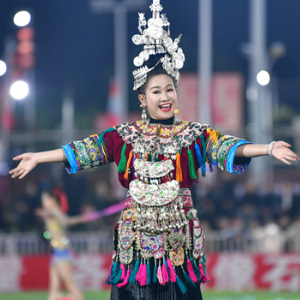演員在貴州“村超”球場演唱動畫電影《哪吒之魔童鬧?!分械亩弊宕蟾枧錁罚?025年3月14日攝)。新華社記者 楊文斌 攝