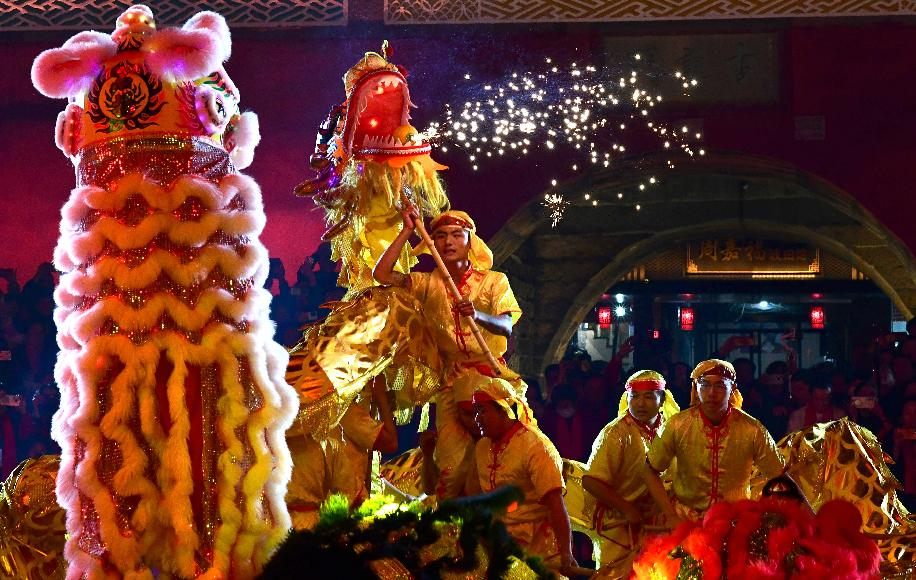 2025年福建省莆田“尾暝燈”文藝踩街活動舉行。這是活動開場的舞龍舞獅表演。(2025年2月26日攝)新華社記者 魏培全 攝