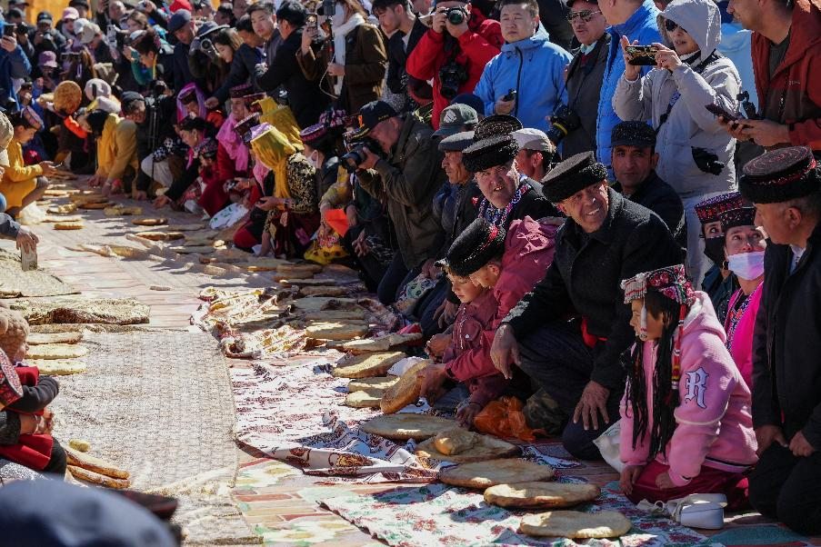 2025年3月22日,在新疆塔什庫爾干塔吉克自治縣“彩云人家”民俗村,當地村民與觀眾分享食物。 新華社記者 徐宏巖 攝