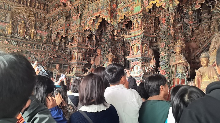 游客在山西省隰縣小西天景區欣賞滿堂懸塑。(2024年10月5日拍攝)新華網 發(劉英攝)