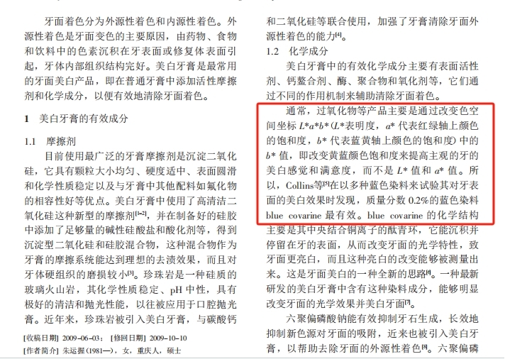 該產品對“色修因子”的美白機理說明,援引自論文《美白牙膏清除牙面外源性著色的研究進展》。記者翻閱了該篇論文,文中指出,通過改變黃藍顏色飽和度來提高主觀的牙的美白感覺和滿意度。具體而言,即借助著色劑改變牙面光學特性,而不是去除污漬或改變牙齒本色。