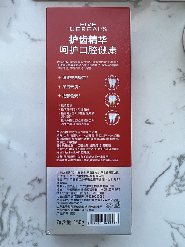 “三天白九度,醫美級牙膏”——在韓方五谷專研美白牙膏的電商頁面中,這句廣告語被置于醒目位置,并配有牙齒從暗黃到潔白的動態對比圖。然而,記者發現該產品外包裝標注的執行標準為普通牙膏的GB/T 8372,而未標注功效型牙膏執行標準QB/T 2966。