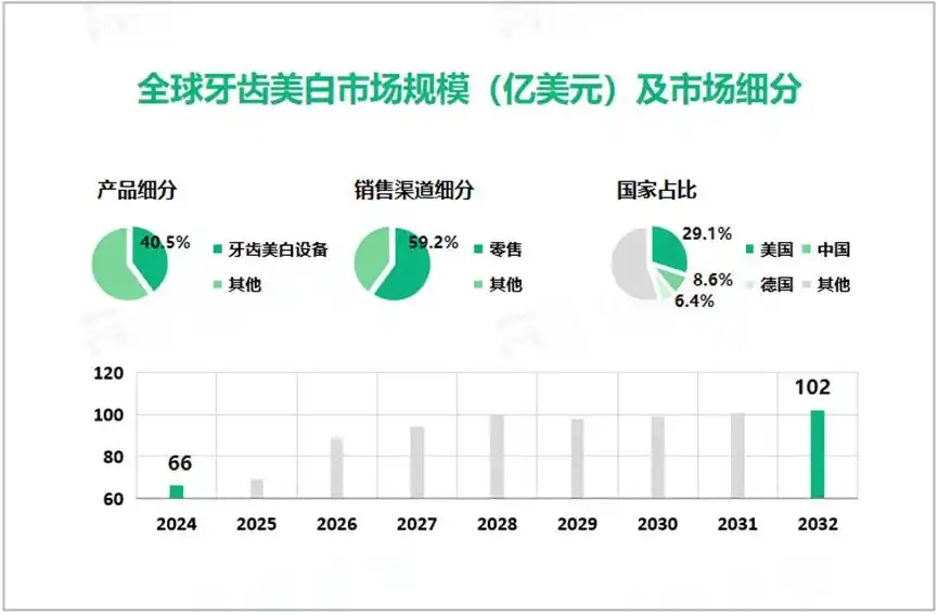 隨著審美觀念的升級與消費結構的變化,口腔美容逐漸成為消費熱點,其中牙齒美白市場發展尤為迅猛。根據貝哲斯咨詢調研數據顯示:2024年全球牙齒美白市場規模達66億美元,預計到2032年將增至102億美元。