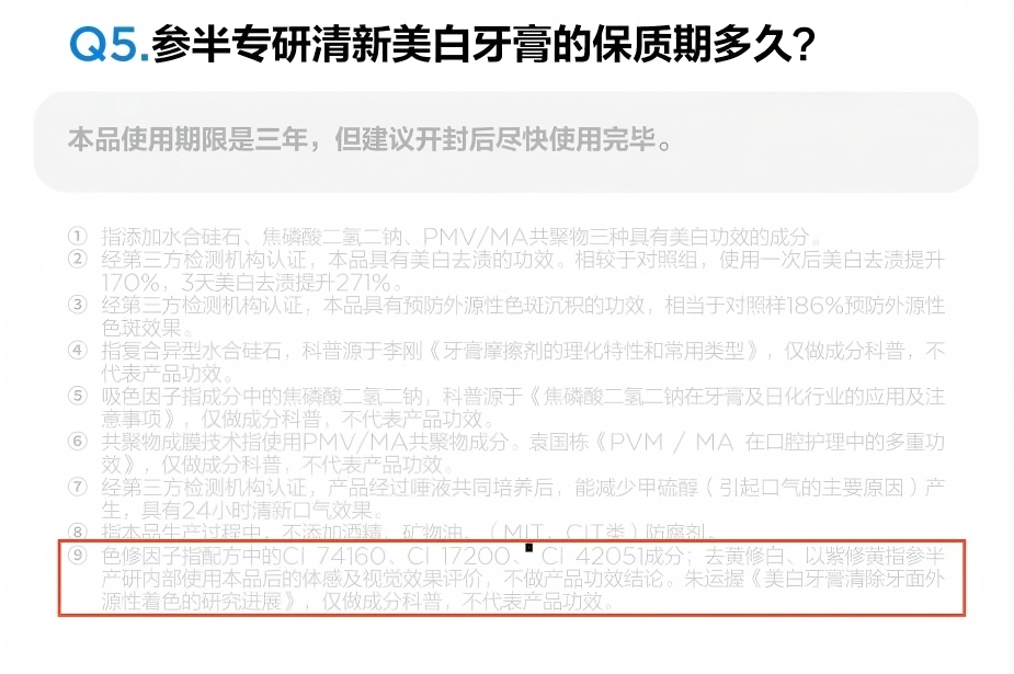 一款參半專研清新美白牙膏在其產品頁面中聲稱其產品含有“色修因子”和“吸色因子”,可以吸色、鎖白。而在頁面的下端,幾行顏色灰白幾乎看不清楚的小字標注,色修因子是指其成分表中的三種著色劑(CL74160、CL17200、CL42051)。