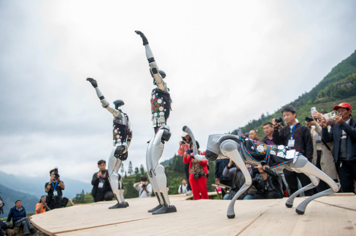 2025年4月26日,機器人在貴州省從江縣加榜梯田上參加梯田走秀活動。新華社發(吳德軍攝)