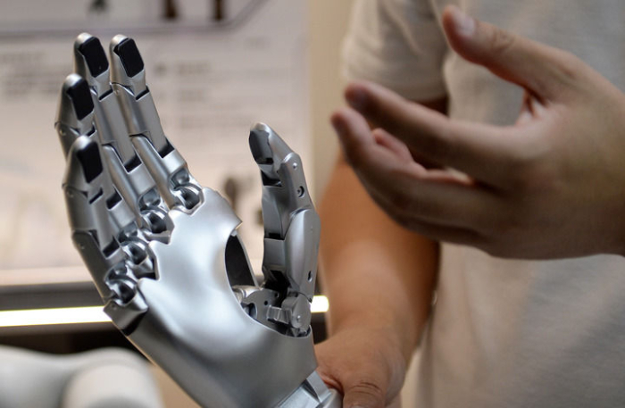 2025年3月25日,在墨現科技(東莞)有限公司,工作人員講解機器人靈巧手上的電子皮膚。新華社記者劉勇貞攝