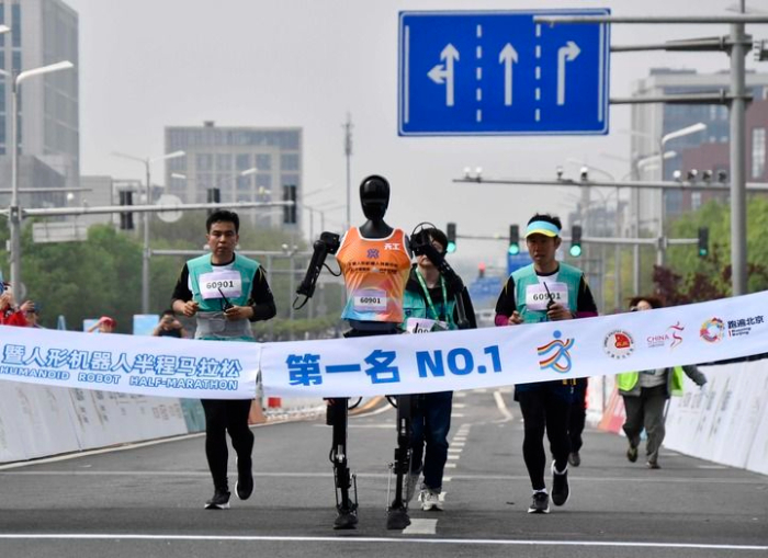 2025年4月19日,在北京亦莊舉行的2025北京亦莊半程馬拉松暨人形機器人半程馬拉松比賽上,天工隊選手天工Ultra(左二)沖向終點。新華社記者李欣攝