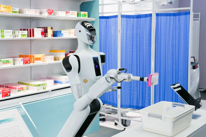 2025年2月24日,在北京“機器人大世界”的應用場景示范區,銀河通用機器人進行藥店無人值守場景演示。新華社記者鞠煥宗攝