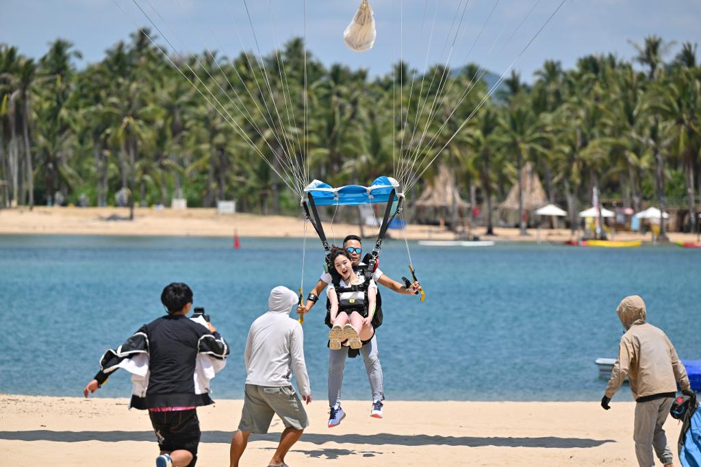 5月2日,游客在三亞塔赫跳傘基地體驗跳傘。新華社記者 郭程 攝