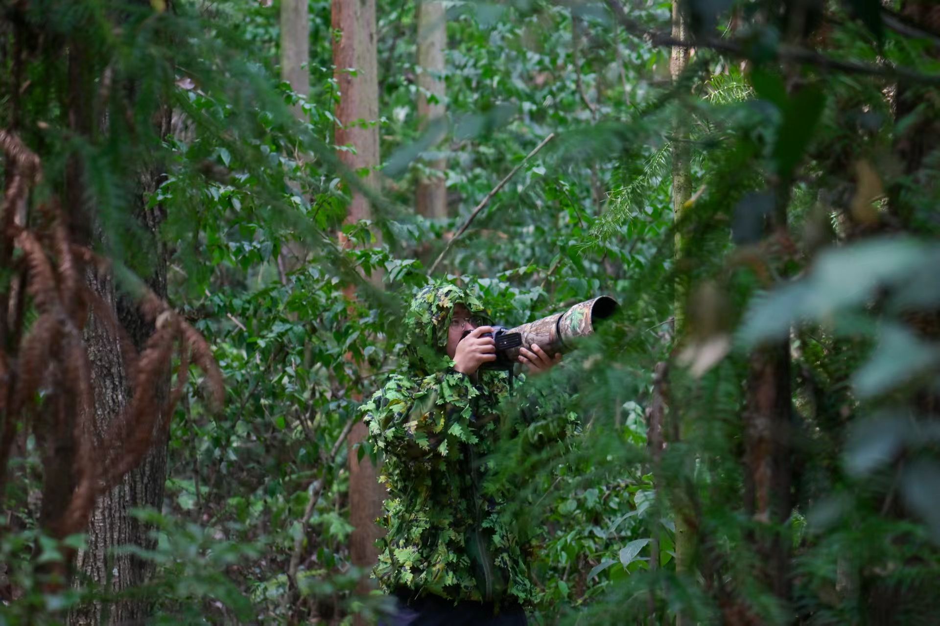 郭康身著偽裝服,在森林里觀鳥。新華網發(受訪者供圖)