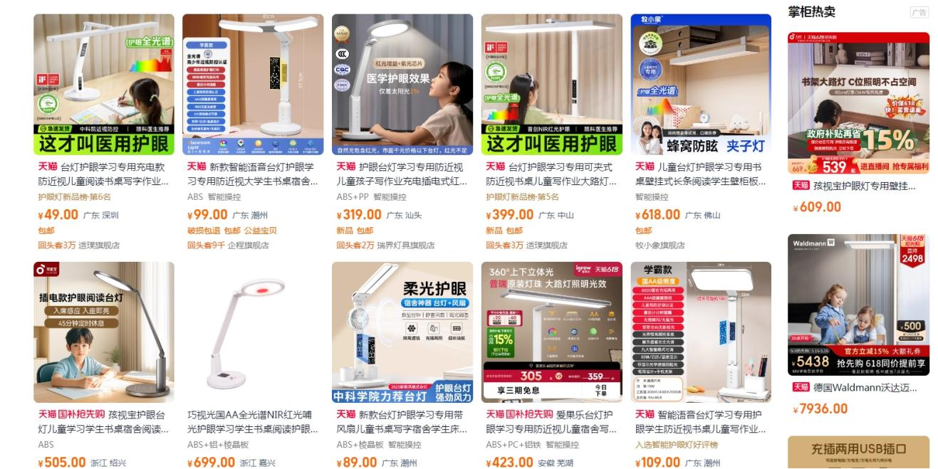 在電商平臺搜索“讀寫作業臺燈”,各種功能宣傳令人眼花繚亂:“全光譜”“零頻閃”“醫用護眼”“納米防?!薄傲闼{光”等詞匯隨處可見,產品價格從幾十元到上萬元不等。